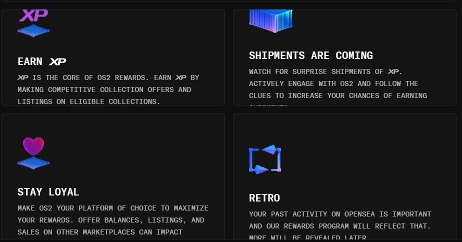 OpenSea 2.0 (OS2) представляет собой существенное обновление исходной платформы, которая исторически доминировала на рынке NFT. В ответ на растущую конкуренцию со стороны таких платформ, как Blur и Magic Eden, OpenSea представила улучшенный пользовательский интерфейс, включая новую систему XP (Experience Points).