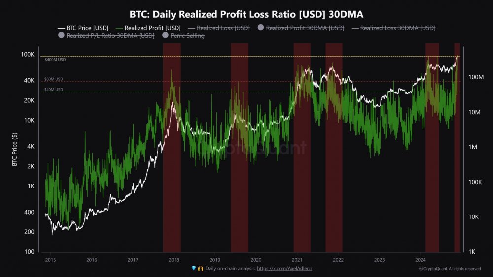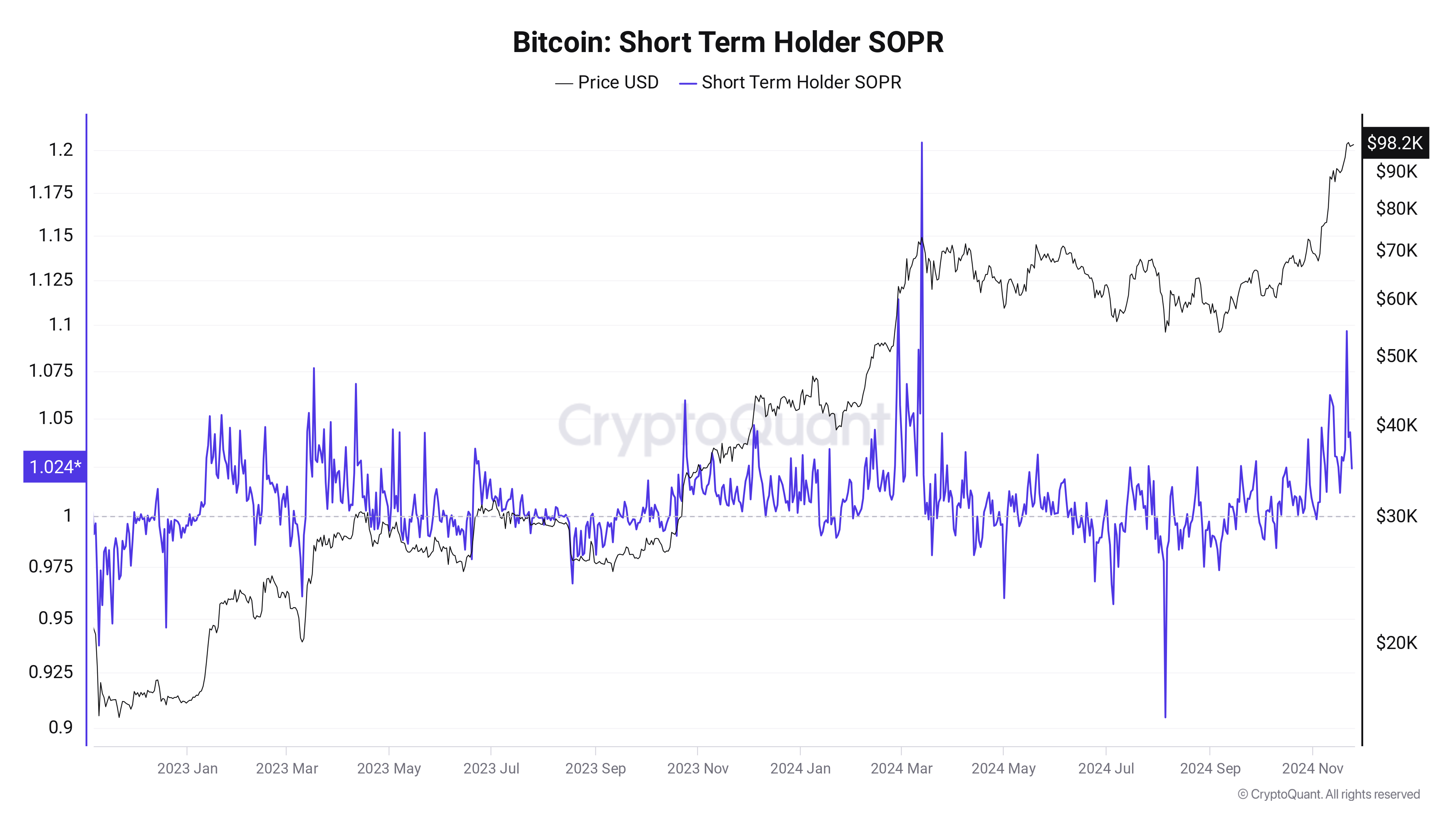«Исторически сложилось так, что при применении 30-дневной скользящей средней к краткосрочному SOPR было замечено, что во время бычьих трендов краткосрочный SOPR обычно достигает отметки 1,02, прежде чем происходит фиксация прибыли. Каждый раз, когда этот уровень был достигнут, цена Биткоина испытывала откат или коррекцию, - отметил он в блоге Quicktake. - В настоящее время 30-дневная скользящая средняя краткосрочного SOPR достигла 1,02, что говорит о том, что цена Биткоина, хотя и близка к 100 000 долларов, может столкнуться с краткосрочной коррекцией».