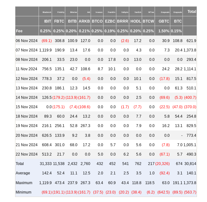 Последние данные от источников, включая британскую инвестиционную компанию Farside Investors, показывают степень интереса к американским ETF. За пять торговых дней до 22 ноября общий чистый приток средств составил 3,35 миллиарда долларов - больше, чем за любую другую неделю.