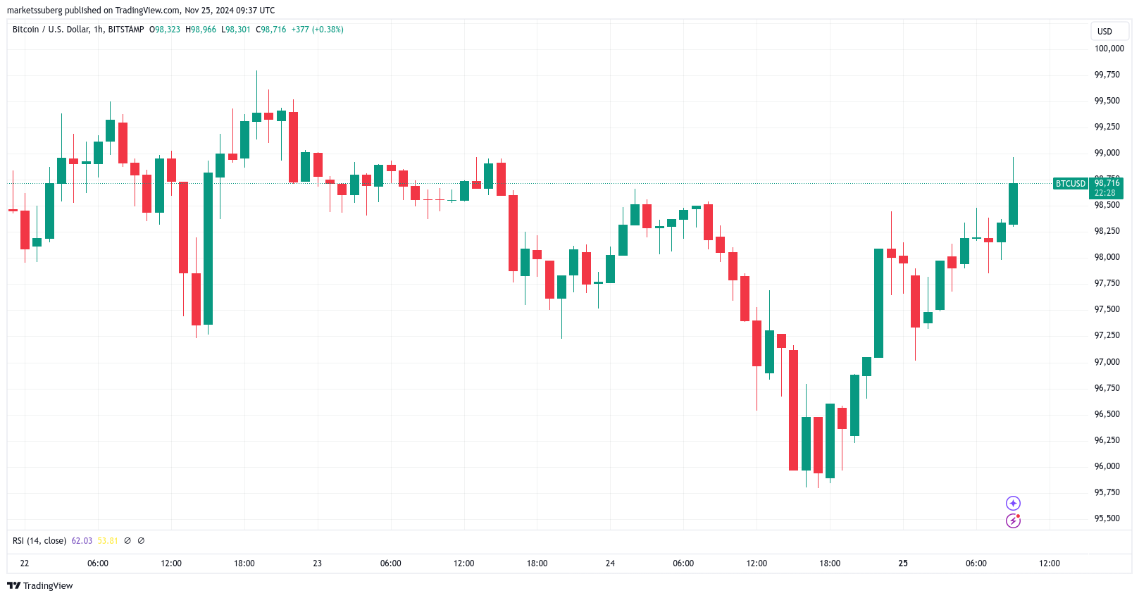 24 ноября биткоин с легкостью зафиксировал самое высокое недельное закрытие в истории на уровне 98 000 долларов.
