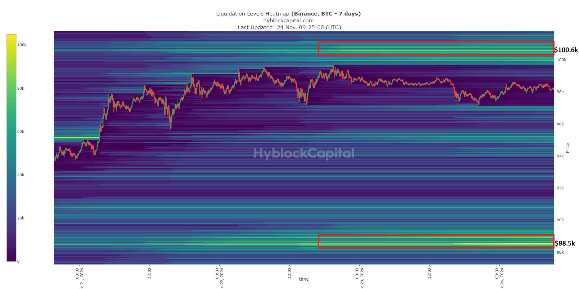 «Если мы посмотрим на 7-дневную карту ликвидаций... Мы видим эти две зоны на графике: $100 600 и $88 500, - прокомментировал он. - Это может быть признаком того, что $88 500 демонстрируют большую ликвидность, чем уровень роста. Так что, в принципе, этой зоне следует уделять немного больше внимания».