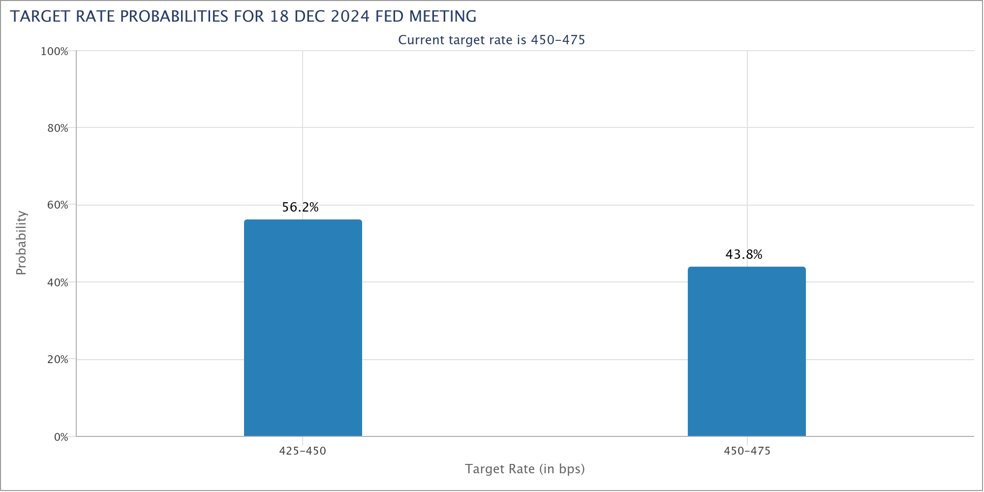 Согласно последним данным инструмента FedWatch от CME Group, в настоящее время вероятность очередного снижения на 0,25% составляет 56% по сравнению с почти 75% месяц назад.