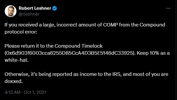 В октябре 2021 года ошибка в обновлении широко используемого протокола DeFi Compound Finance вызвала невероятно щедрую раздачу пользователям.