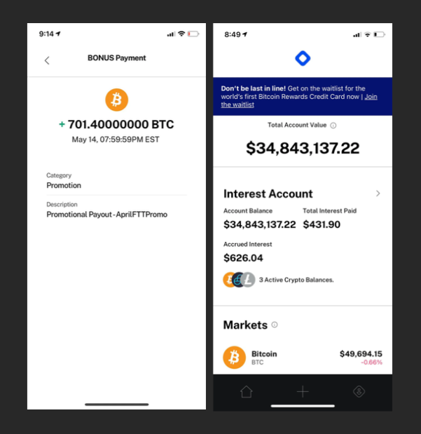 BlockFi организовал акцию со стейблкоином Gemini Dollar (GUSD), в рамках которой определенным клиентам выплачивались бонусы. Целью акция было предоставление пользователям дополнительных преимуществ для поддержания определенного баланса долларов на своих процентных счетах BlockFi. Однако из-за ошибки BlockFi вместо GUSD некоторым пользователям был отправлен биткоин — и кое-кто получил до 700 BTC.