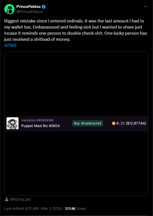 Коллекционер произведений искусства NFT PrincePablos думал, что купил NFT за 0,021 BTC, что составляет около 1287 долларов. Однако после транзакции трейдер понял, что NFT указан за 0,21 BTC (примерно 12 877 долларов США).