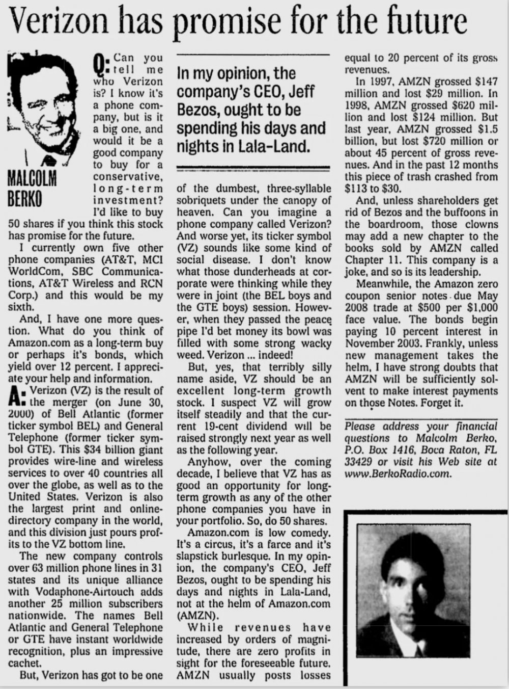 Точно так же в начале 2000-х Amazon и Джефф Безос столкнулись с пристальным вниманием и скептицизмом. В то время, когда акции Amazon торговались около 50 долларов, USA Today заявила: