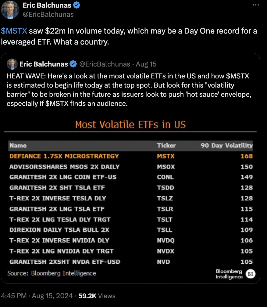 Объем ETF Defiance Daily Target 1,75X Long MSTR (MSTX) достиг 22 миллионов долларов в первый день. Источник: Х.