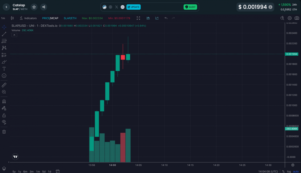 Цена $SLAP сразу взлетела на 1590% до $0,001994. За последние 24 часа токен прибавил еще 494% и сейчас торгуется на бирже по $0,006103.