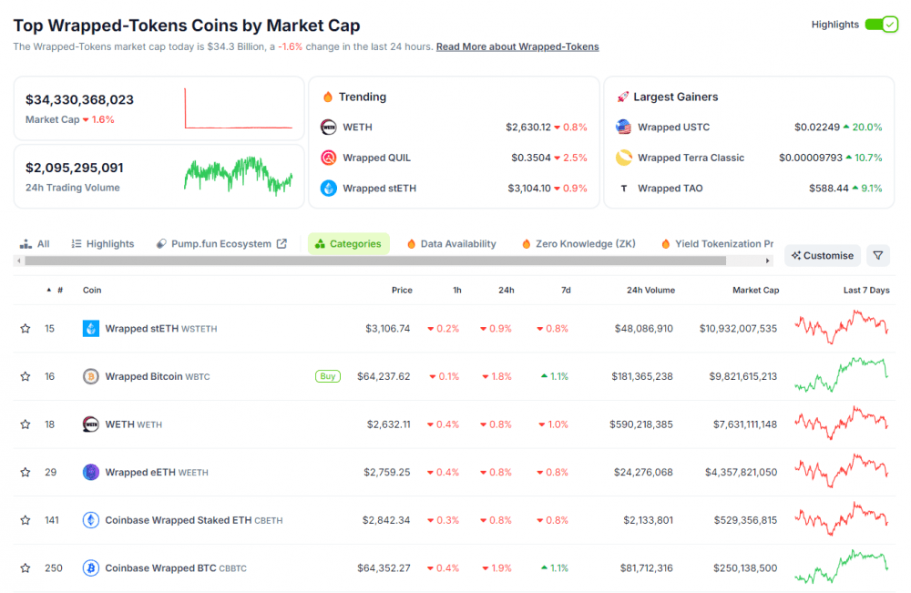 Рисунок 1. WBTC - самый популярный обернутый токен. Источник: CoinGecko.