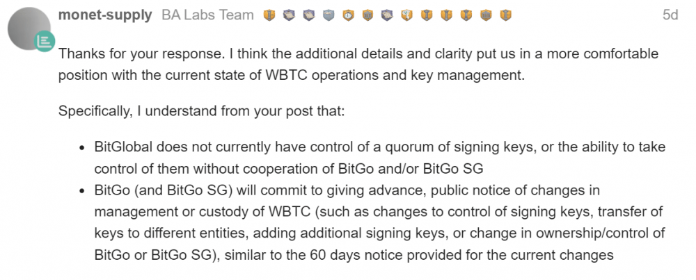 9 августа BitGo сообщила о планах предоставить частичный контроль над биткоин-активами wBTC гонконгской криптобирже BitGlobal. Партнерство не было одобрено.