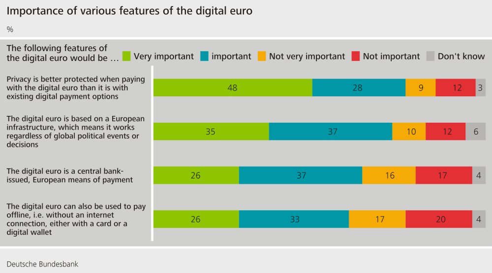 Опрос Бундесбанка показал, что, несмотря на широко распространенное невежество, три четверти респондентов оценили конфиденциальность при использовании цифрового евро как очень важную деталь.