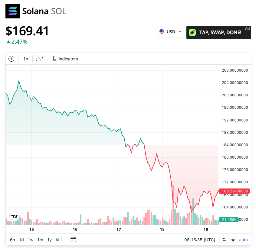 Цена на SOL также упала более чем на 17% с момента запуска LIBRA 14 февраля, снизившись с 204 долларов до 169 долларов на момент написания статьи.