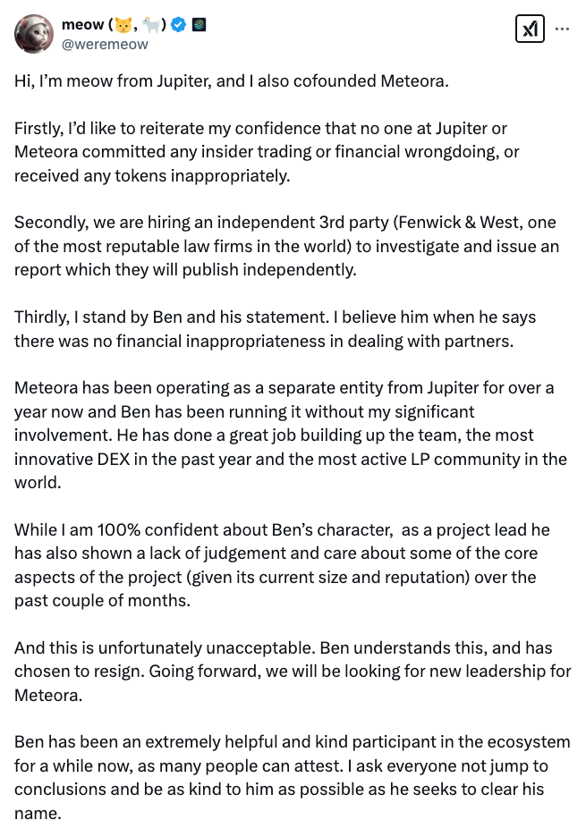 «Я хотел бы подтвердить свою уверенность в том, что никто в Jupiter или Meteora не совершал никаких инсайдерских торговых или финансовых нарушений и не получал токены ненадлежащим образом».