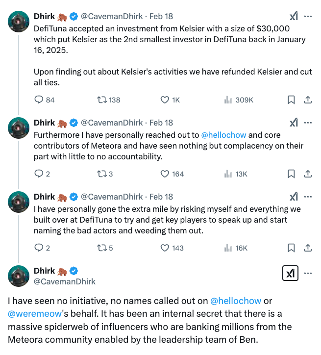18 февраля основатель DeFiTuna Моти Поволоцкий, известный на X под псевдонимом Caveman Dhirk, заявил, что Бен Чоу создал сеть влиятельных людей, которые получили значительную прибыль от токенов знаменитостей, несмотря на угрозу для участников розничного рынка.