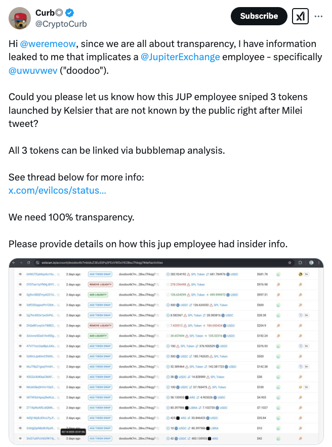 Другие эксперты отрасли, в том числе криптотрейдер, известный под псевдонимом Curb, утверждали, что сотрудник Jupiter участвовал в подготовке запуска токена. Однако из-за небольших сумм, используемых данным адресом кошелька, - от 10 до 250 долларов - маловероятно, что это были попытки мошенничества, и, скорее всего, это было неустойчивое торговое поведение.