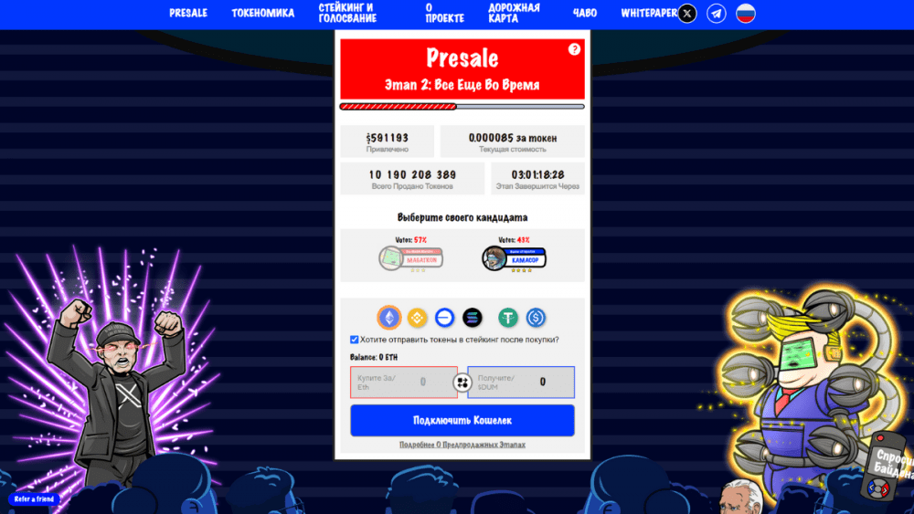 Токеномикой проекта предусмотрено, что около 108 миллиардов токенов $DUM будет выделено на предварительную продажу. Стать участником цифровых выборов можно на официальном сайте проекта, подключив цифровой кошелек, например, Best Wallet.