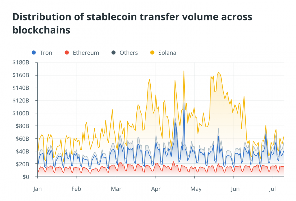 По состоянию на июнь 2024 года Tron является вторым по величине блокчейном по объему переводов стейблкоинов. Стабильный спрос сети на платежи в долларах США поддерживает ее активную деятельность, обеспечивая надежный источник доходов от протокола. Также заслуживает внимания дефляционная токеномика TRX с уровнем инфляции -2,4% в годовом исчислении по сравнению с Эфиром +0,4%.