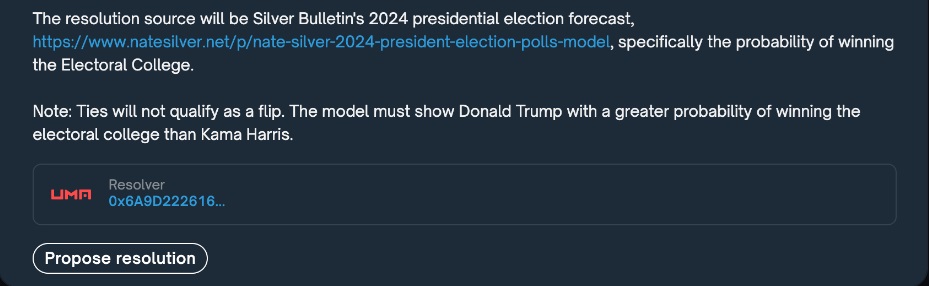 Пример правила Polymarket для ставок на выборы, основанного на использовании одного веб-сайта вместо модели искусственного интеллекта для решения проблем. Источник: Polymarket.