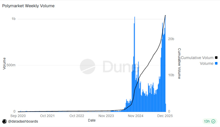 На прошлой неделе, по данным Dune Analytics, номинальный объем торгов на Polymarket превысил 1 200 000 000 долларов. Медиагигант CNBC заключил партнерство с рынком прогнозов Kalshi для интеграции данных прогнозов в свои телевизионные, цифровые и подписные платформы.