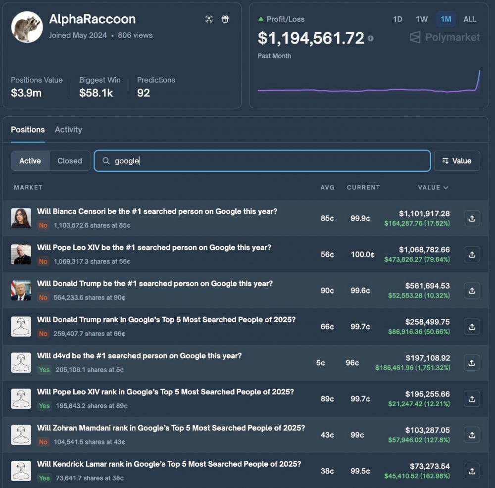 Трейдер под псевдонимом AlphaRaccoo заработал более 1 000 000 долларов на ставках, связанных с рейтингом результатов поиска Google. Сообщается, что он также заработал 150 000 долларов, предсказав точный день запуска Google новой версии своей модели искусственного интеллекта Gemini.