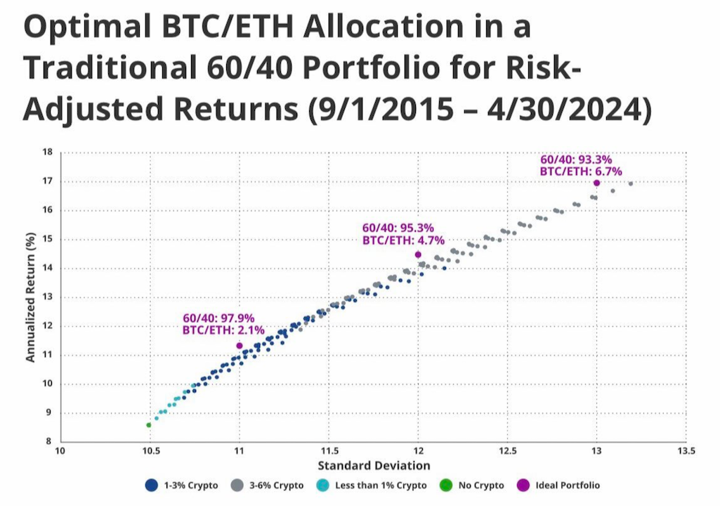 VanEck в числе первых высказались по этому поводу. Они опубликовали исследовательский отчет, вероятно, еще шесть месяцев назад, сразу после запуска биткойн-ETF. По сути, это была гистограмма, показывающая, что традиционные 60 на 40 приносят вам около 9% прибыли. Но не в том случае, если бы вы использовали комбинацию Bitcoin и Ethereum. Они рассмотрели разные уровни распределения, верхний уровень распределения составлял 7%. Итак, если бы вы имели 60% акций, 33% облигаций и 7% биткоинов и ETH, вы получили бы не 9%, а17% прибыли.