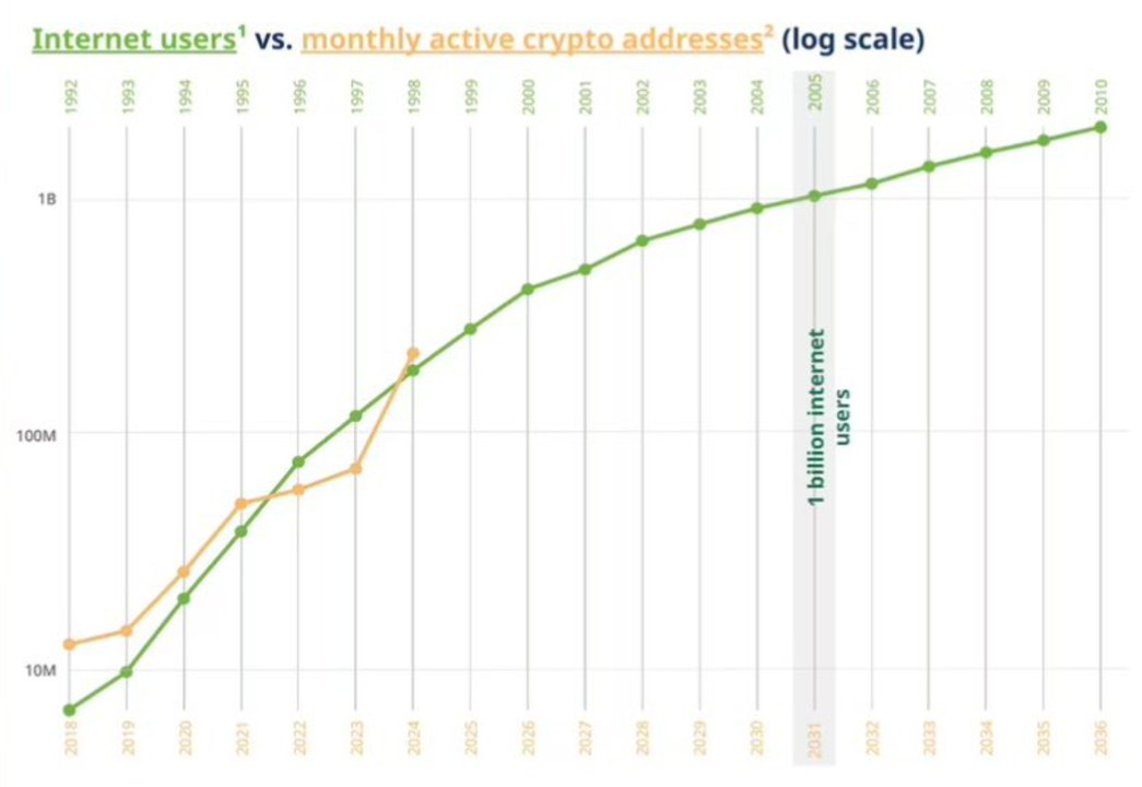 БР: Я пытаюсь рассмотреть совокупность факторов, которые пересекаются с фундаментальными принципами. Настроения, позиционирование, ликвидность и технические характеристики. И когда я смотрю на эти факторы, я думаю, что сейчас дела обстоят немного лучше, чем тогда. Знаете, основная история для меня остается нетронутой. Если вы посмотрите на ежедневные активные кошельки на уровне L1, то увидите, что за последние 3–4 года они выросли примерно на 800%. Это было исследование, которое провел Дэн Тапьеро. Если вы посмотрите на недавний отчет A16z State of Crypto, то увидите, что у них есть ежемесячные активные крипто-адреса L1, взаимодействующие с L1, на уровне 220 миллионов, что является рекордным показателем и постепенно увеличивается.