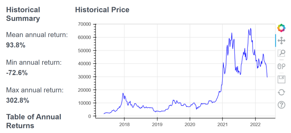 Согласно данным UpMyInterest, за исключением нескольких нерабочих лет, биткоины продемонстрировали среднюю годовую доходность в размере 93,8%, которая в самый продуктивный год выросла до 302,8%.