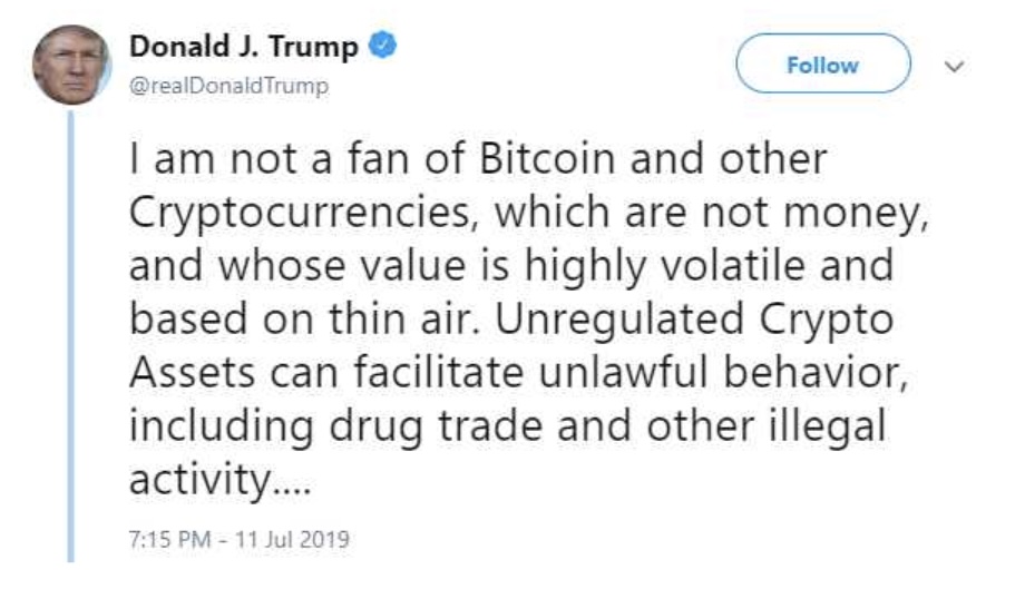Рисунок 1. Дональд Трамп написал в 2019 году, что он "не фанат Биткоина и других криптовалют". Источник: X.