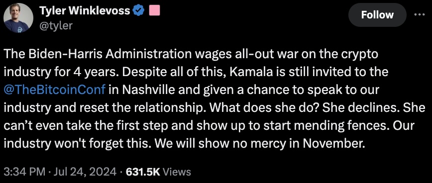 Рисунок 2. Камала Харрис отклонила приглашение выступить на Биткоин-конференции в Нашвилле в июле 2024 года. Источник: X.
