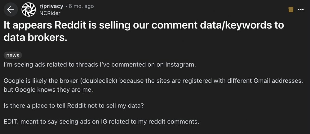 В январе пользователь Reddit отметил, что Reddit продавал пользовательские данные Google — вскоре после того, как он перестал разрешать пользователям отказываться от обмена данными. Источник: Reddit.