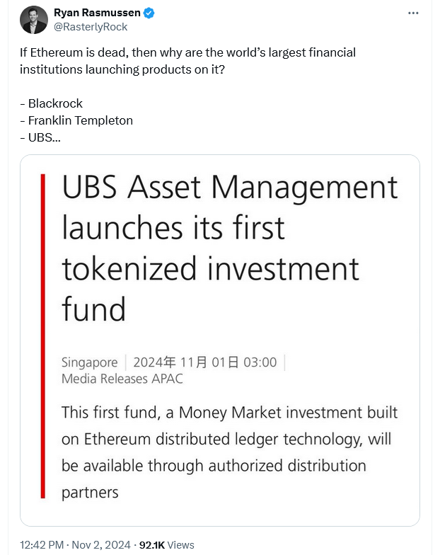 BlackRock, крупнейшая в мире компания по управлению активами, токенизировала средства денежного рынка на Ethereum на сумму более 533 миллионов долларов. 1 ноября Union Bank of Switzerland запустил токенизированный фонд.