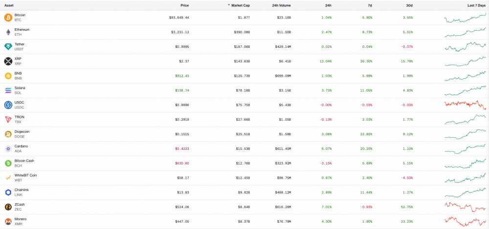 Во вторник биткоин торговался около 93 700 долларов, подорожав примерно на 1% за 24 часа и более чем на 7% с 1 января. Ethereum вырос почти на 2% до 3224 долларов и примерно на 9% за тот же период. XRP возглавил список крупных компаний, подскочив почти на 13% за день до 2,40 долларов и почти на 29% за неделю, в то время как Solana выросла на 12%, а DOGE - примерно на 23% за последнюю неделю.