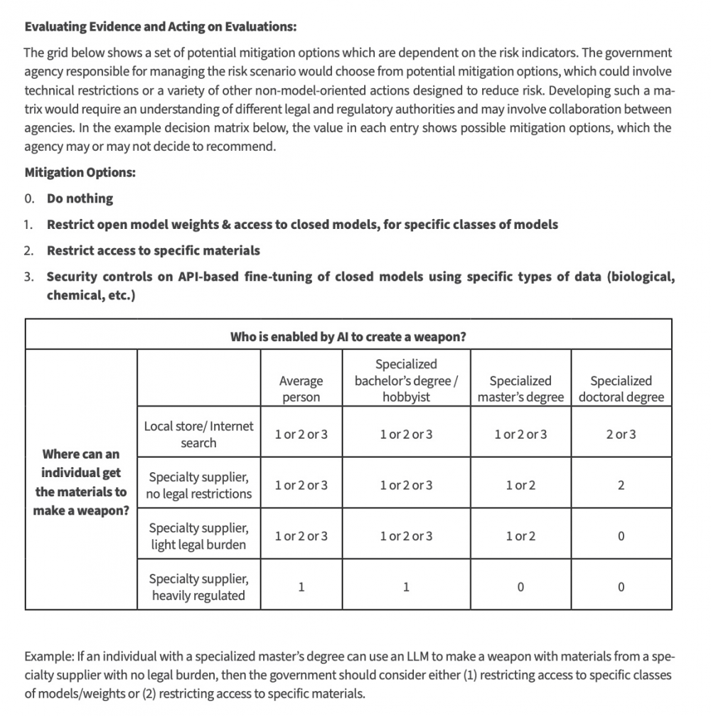 В итоговом отчете в основном приветствуются открытые системы искусственного интеллекта и «намечается осторожный, но оптимистичный путь» для них. В отчете делается вывод, что «нет достаточных данных о предельных рисках базовых моделей двойного назначения с широко доступными весами моделей, чтобы сделать вывод о том, что в настоящее время ограничения на веса моделей являются уместными или что ограничения никогда не будут уместны в будущем».