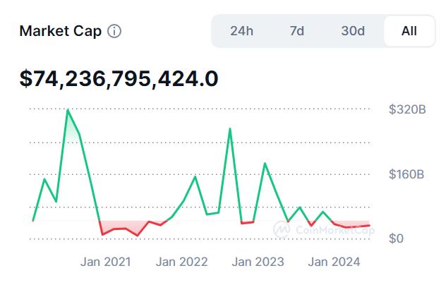 Рыночная капитализация NFT на пике достигла 320 млрд долларов. По состоянию на 14 августа она составляет около 74 млрд долларов. Источник: CoinMarketCap.