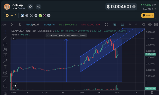 После резкого роста цена токена упала до $0,0038, но откат принес новые деньги в Catslap, и цена снова начала движение вверх.