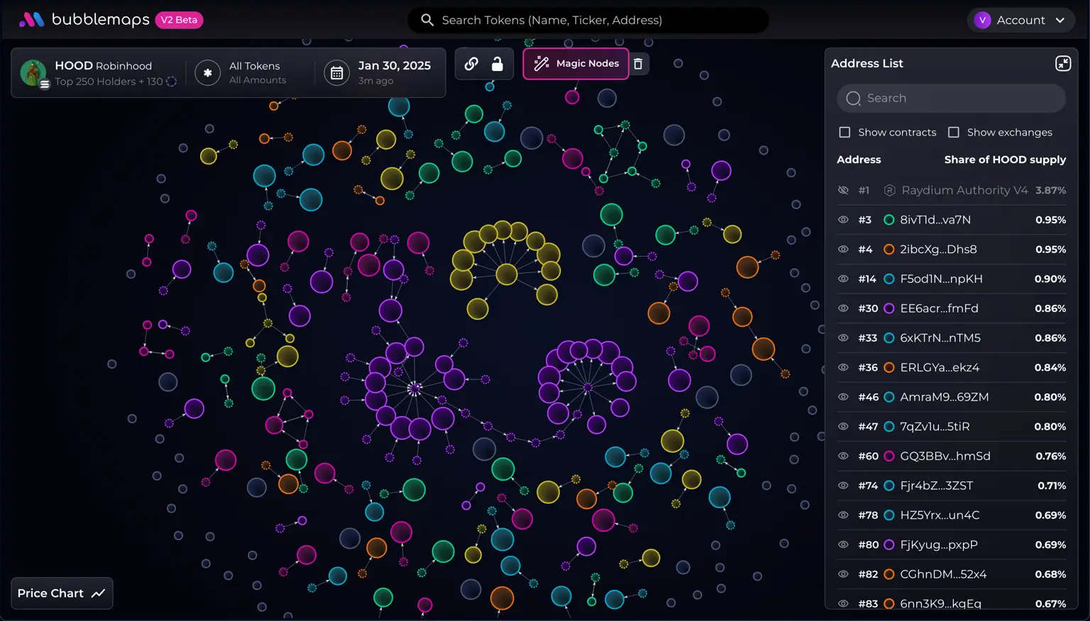 Bubblemaps - это визуальный движок для ончейн-аналитики. Платформа Bubblemaps преобразует необработанные данные блокчейна в структурированные визуальные данные, позволяя трейдерам, фондам и аналитикам исследовать сети, выявлять инсайдерскую активность и отслеживать ранние рыночные сигналы в блокчейнах.