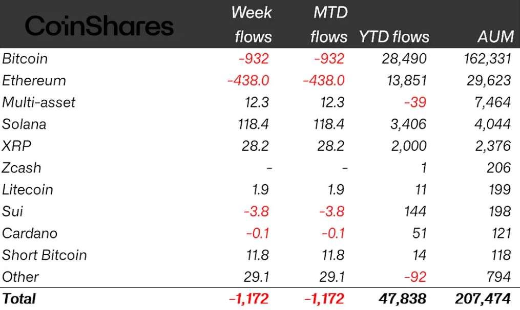 После двух последовательных недель оттока средств общим объемом $1,5 млрд активы под управлением в криптовалютных биржевых продуктах упали до $207,5 млрд. Это самый низкий показатель с середины июля. Совокупные активы под управлением достигли пика в начале октября, превысив $254 млрд.