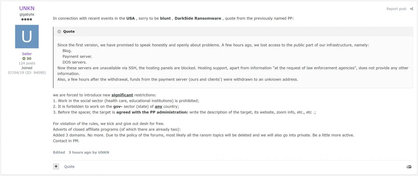 UNKN пишет, что его собственная банда теперь должна ввести значительные ограничения, избегая медицинских, образовательных и государственных учреждений, одновременно делясь сообщением от DarkSide о потере доступа к своему блогу, серверу платежей Tor и серверам DOS.