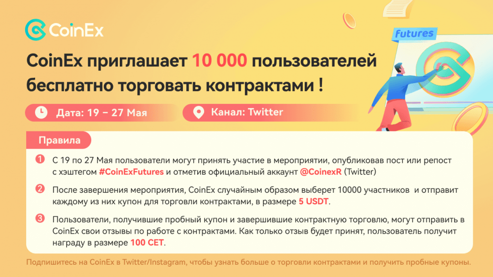 Будучи опытной платформой для торговли криптоактивами, CoinEx уже давно запустила продукт с бессрочными контрактами, чтобы предоставлять пользователям простые и удобные в использовании контрактные услуги. Даже в условиях нынешнего рыночного спада CoinEx заботится о своих пользователях. Биржа запустила тематическое мероприятие в Twitter «CoinEx приглашает 10 000 пользовалетей бесплатно торговать контрактами».