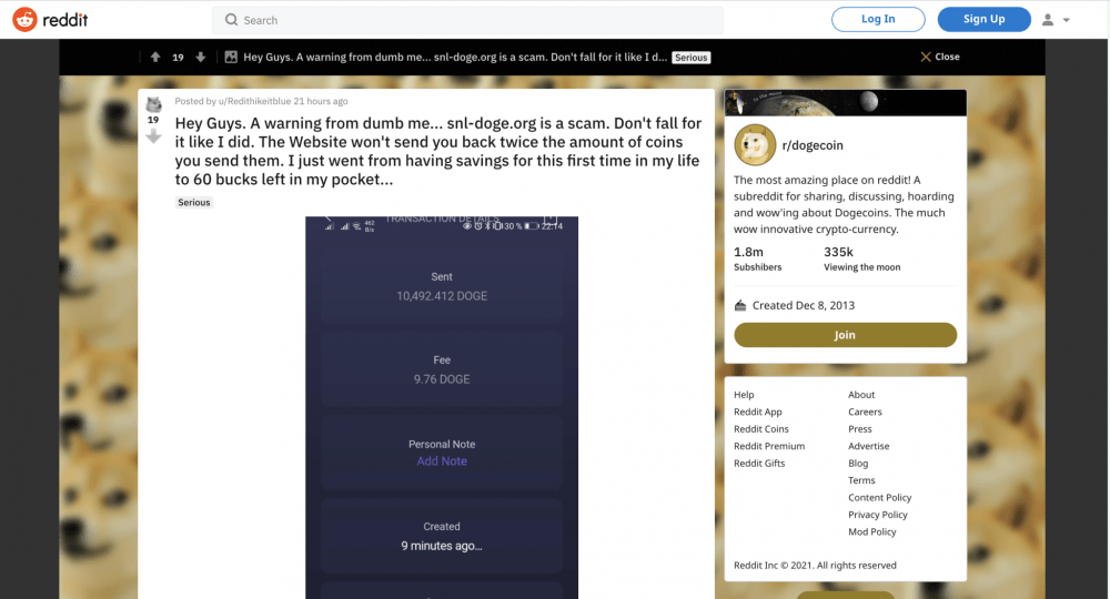 Пользователь Redithikeitblue на Reddit обратился к другим держателям криптовалюты в сообщении, которым он поделился в своем сабреддите Dogecoin : «Предупреждение тебе из моей глупой головы. …. Не дайте себя обмануть. Сайт не отправит вам вдвое больше денег, чем вы им отправите. Впервые в жизни у меня были сбережения. Теперь у меня в кармане осталось 60 долларов ".