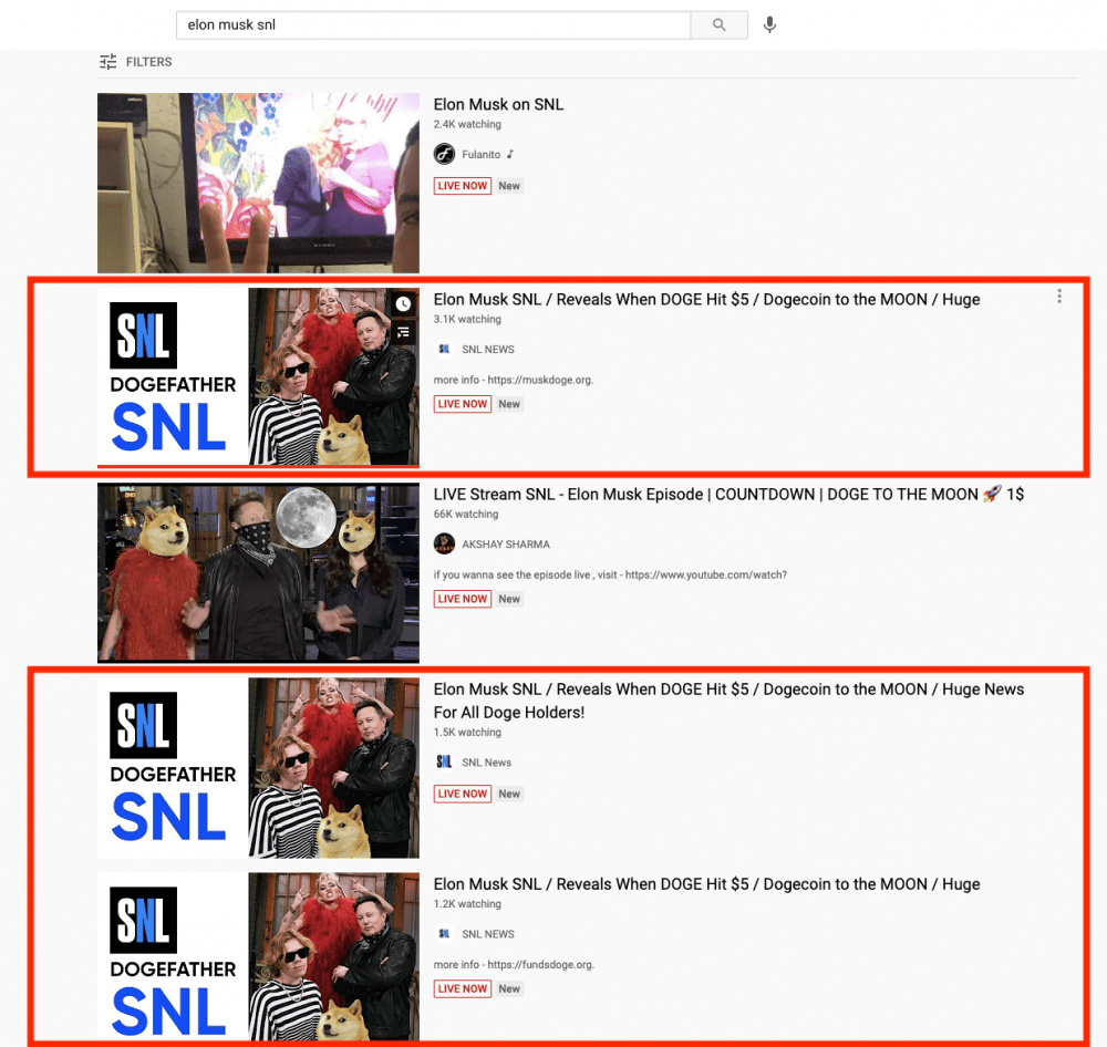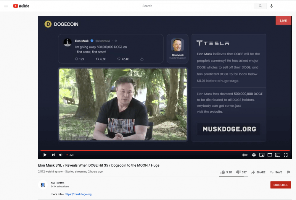 Мошенники, использующие SNL, создавали различные публикации на YouTube, говоря: «Илон Маск раздает 500 миллионов DOGE среди всех владельцев DOGE».
