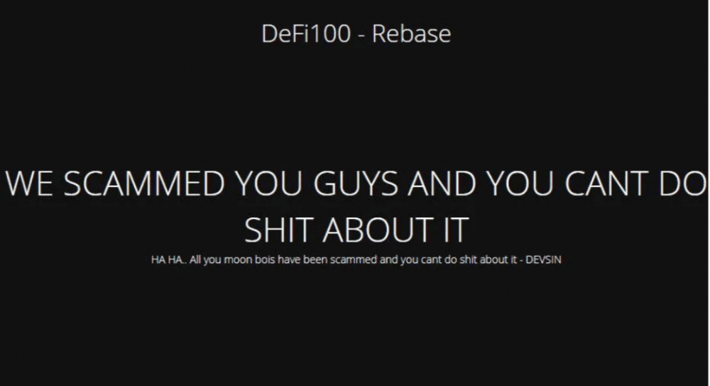 Несколько часов назад не очень классное сообщение приветствовало посетителей сайта DeFi100.org, говоря инвесторам, что их обманули и "вы не можете ничего с этим поделать". Хотя эта страница с тех пор была удалена, вот скриншот экрана: