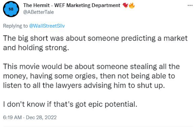 «Сюжет The Big Short заключался в том, что кто-то предсказывал рынок и держался уверенно. Этот фильм был бы о том, как кто-то крадет все деньги, устраивает какие-то оргии, а потом не слушает своих адвокатов, советующих ему заткнуться», – написал WallStreetSilv.