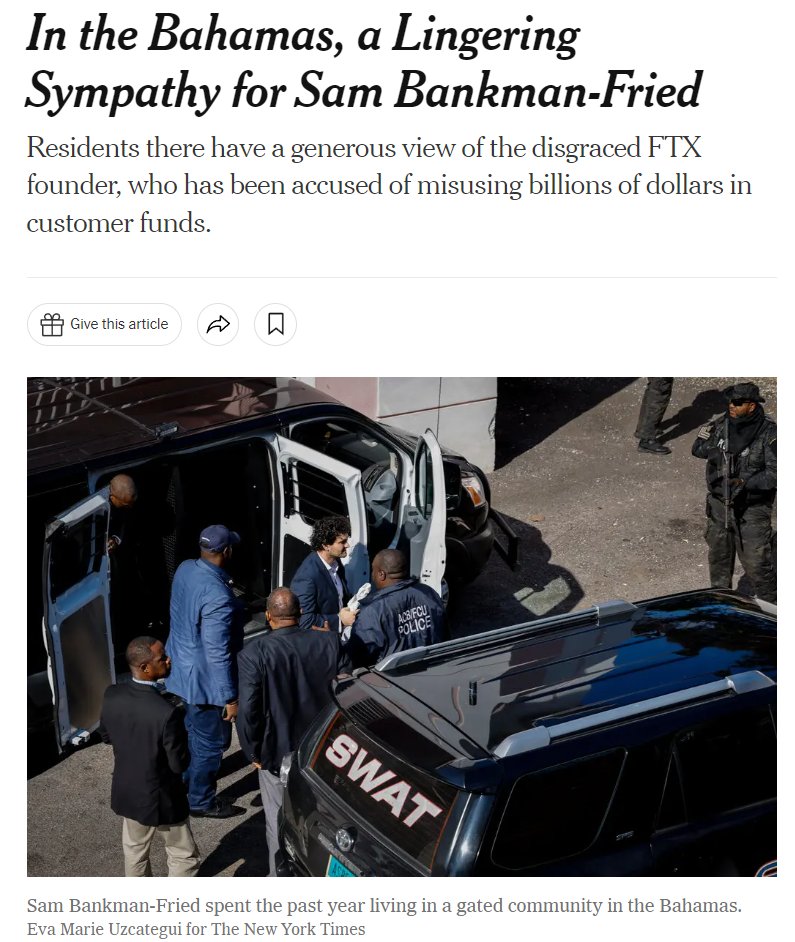 В опубликованной 26 декабря статье под названием «На Багамах сохраняется сочувствие к Сэму Бэнкману-Фриду» журналист New York Times Роб Коупленд цитирует местных жителей Багамских островов, которые, по-видимому, в основном положительно отзываются об основателе криптовалютной биржи.