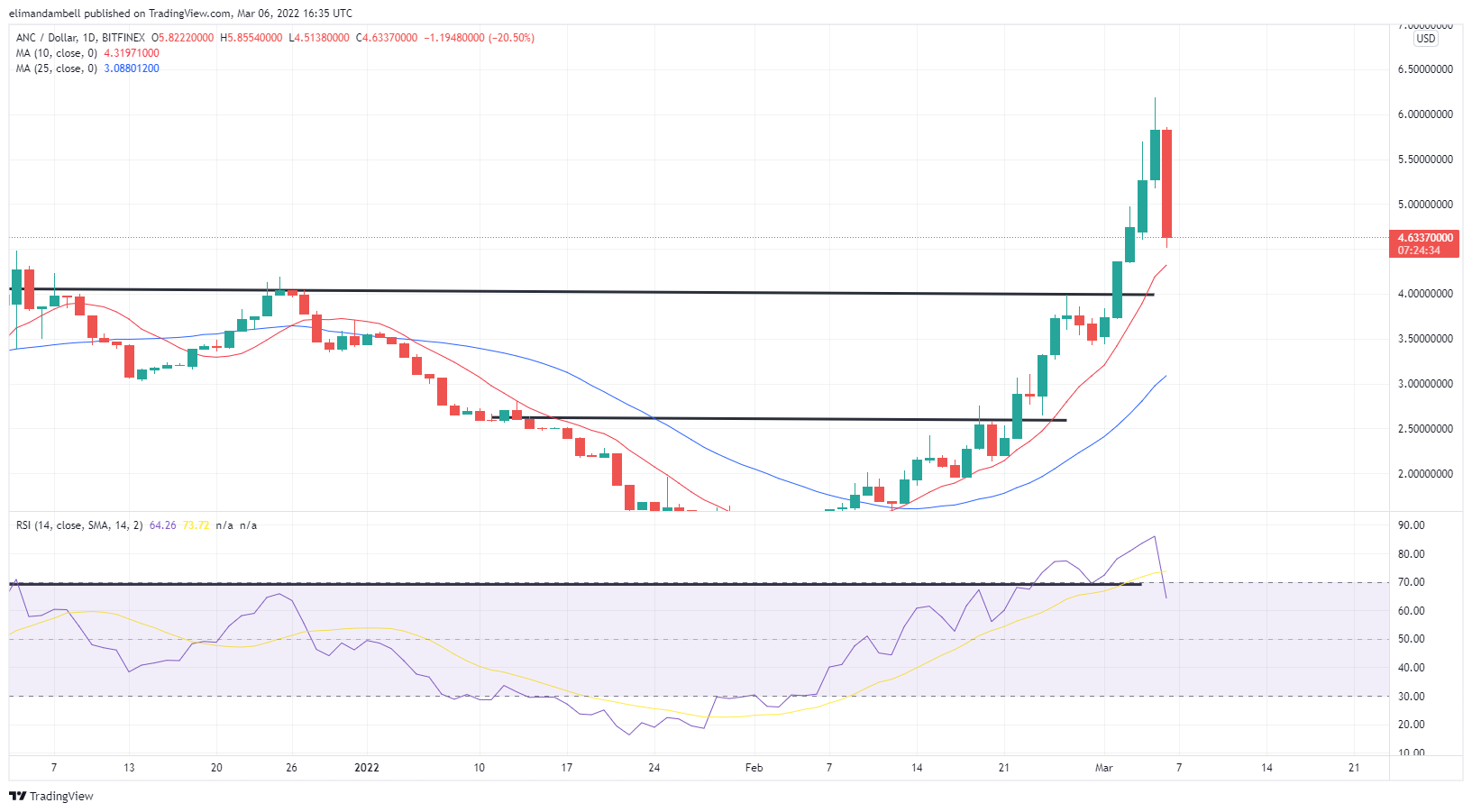 Это падение теперь означает, что рекордный максимум цены ANC составляет 6,18 долларов США и происходит после того, как восходящий ценовой импульс, казалось бы, закончился. Цены были перекуплены на большую часть его взлета, и многие считали неизбежной падение. 14-дневный RSI теперь проходит ниже 63, после того, как поднялся до 86 в начале этой недели.