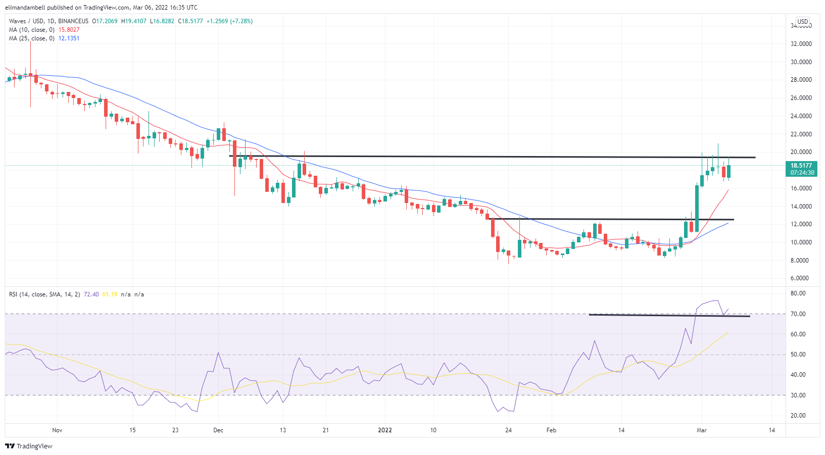 Этот шаг поднял WAVES на 5,23% выше на момент написания этой статьи, при этом 14-дневный RSI продолжал парить над перекупленной территорией. Сила цены в настоящее время составляет 72,4, и теперь похоже, что она пытается вернуть сопротивление 76,9. Однако, как мы видели с АНК, когда рынки перекуплены в такой степени, натиск медведей также возможен.