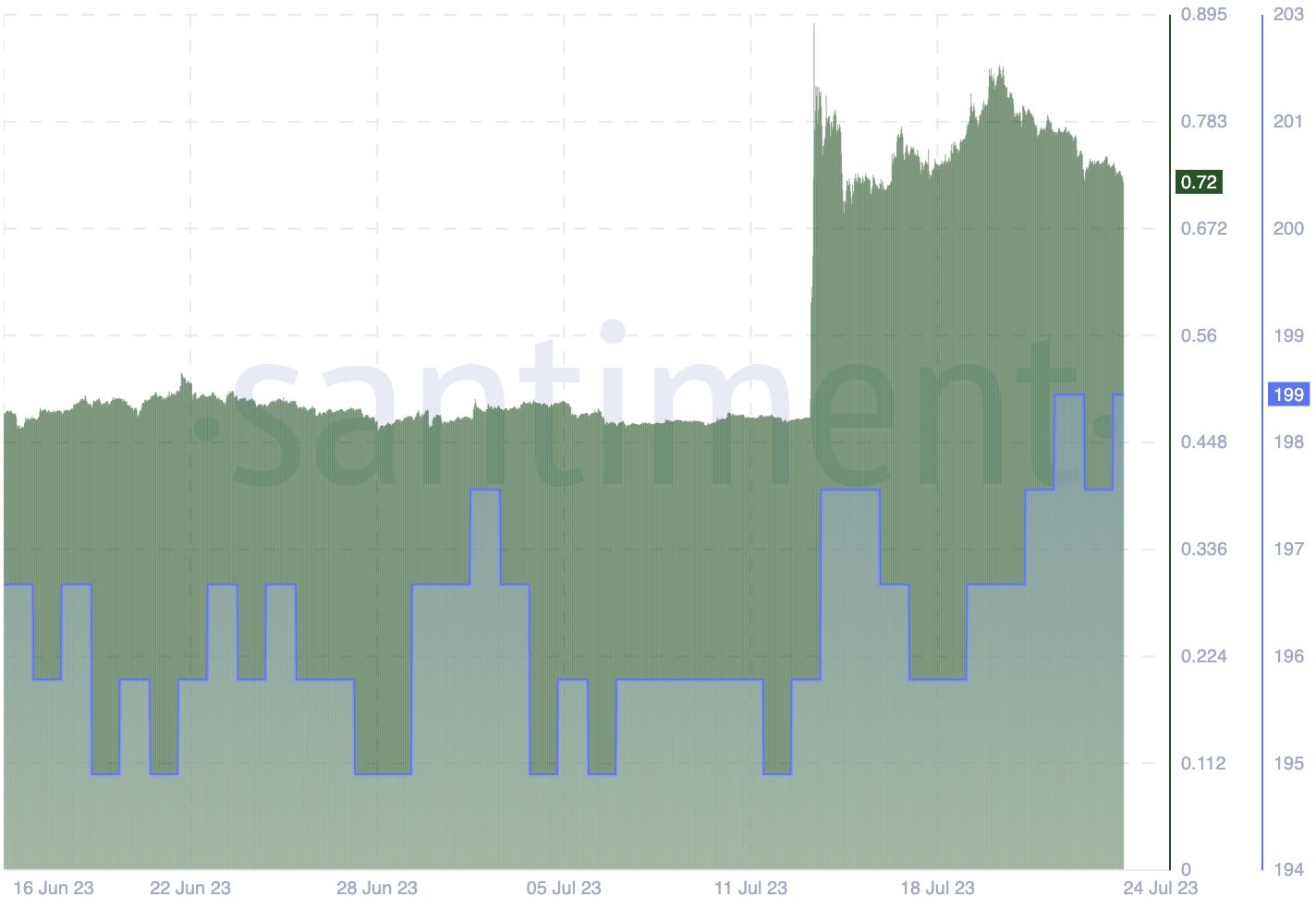 Как показано на графике Santiment, всплеск количества кошельков mega XRP точно совпал с важным событием 13 июля, когда суд, наконец, прояснил статус токена, не связанный с безопасностью. В то время количество кошельков whale, содержащих криптовалюту, составляло 196.