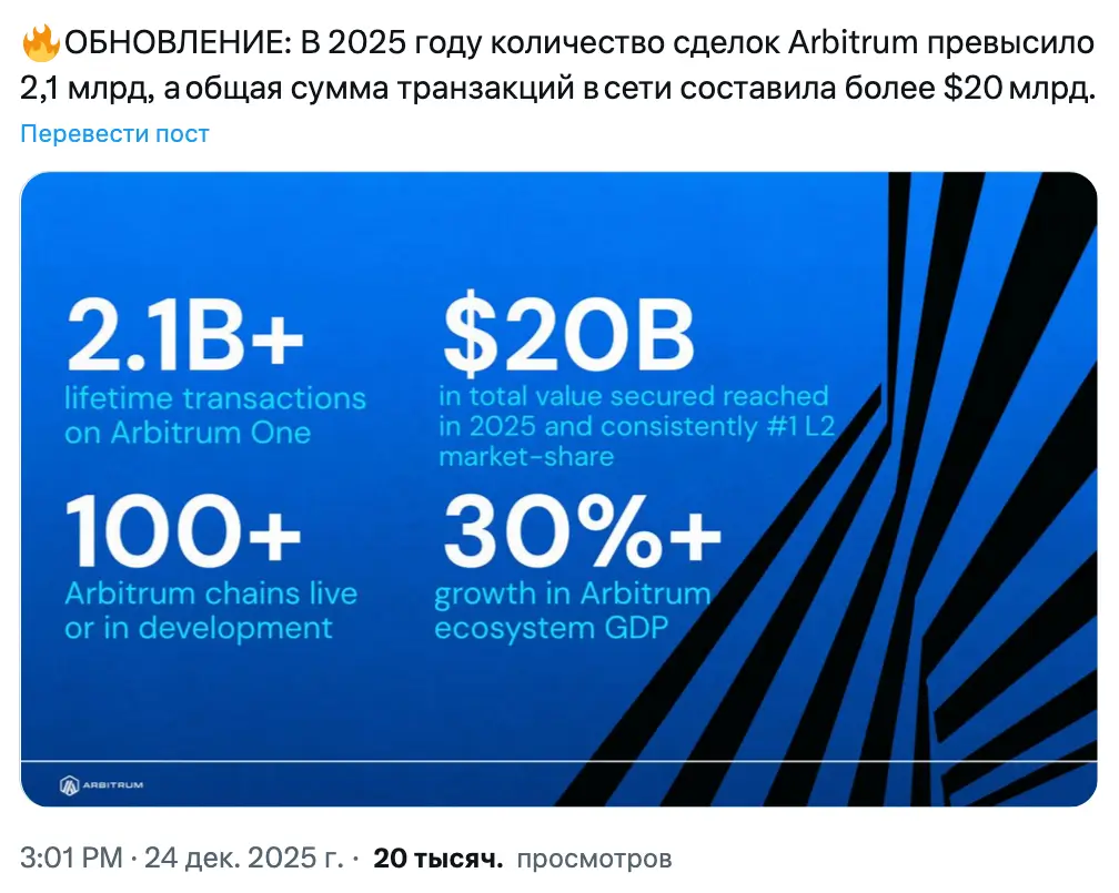 Arbitrum также сообщила, что в 2025 году общая защищенная стоимость в сети достигла $20 млрд. Проект стабильно остается крупнейшим L2‑решением для Ethereum по доле рынка.