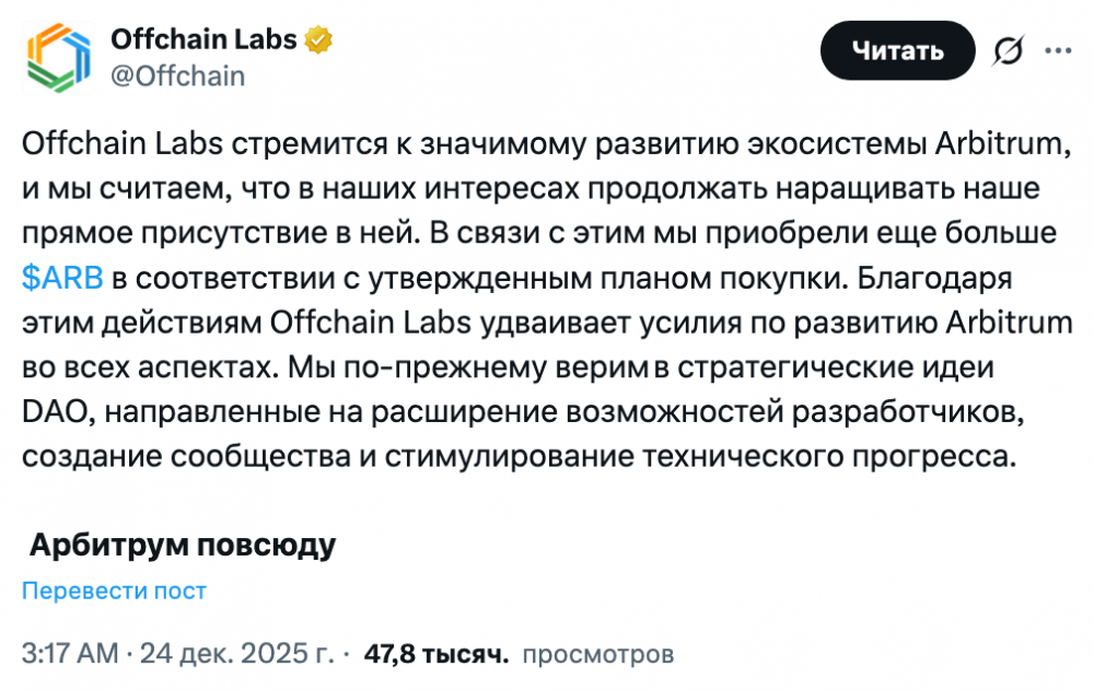 На этой неделе Offchain Labs сообщила в соцсети X, что остается «приверженной значимому развитию экосистемы Arbitrum». Компания уточнила: она увеличила прямую долю в токенах Arbitrum (ARB) в рамках утвержденного плана закупок.