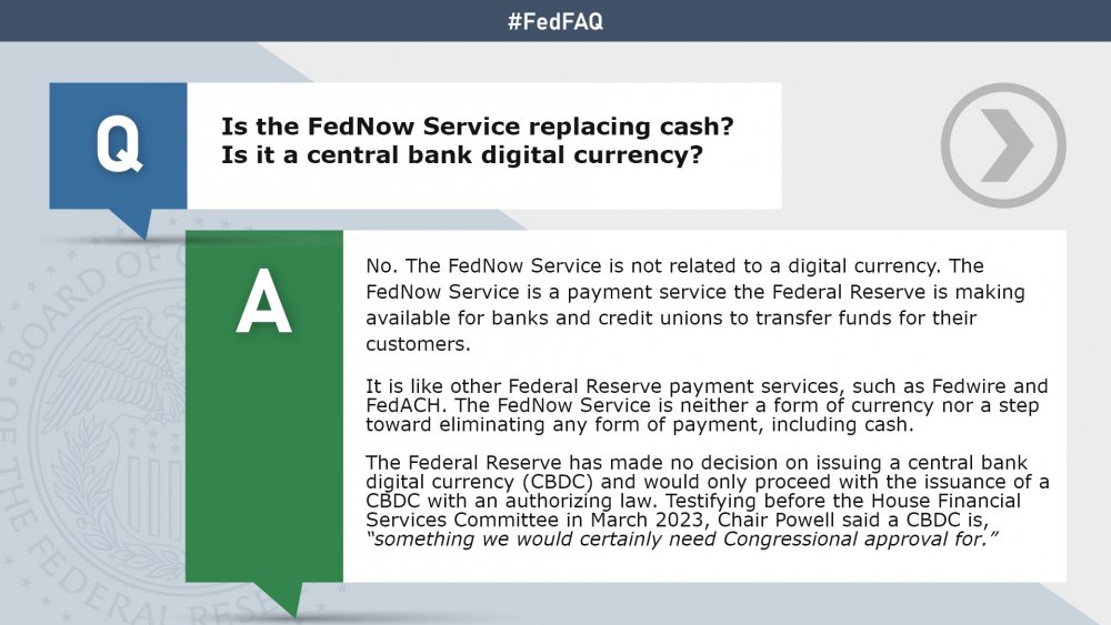 «Это похоже на другие платежные сервисы Федеральной резервной системы, такие как Fedwire и FedACH. Служба FedNow не является ни формой валюты, ни шагом к отказу от любой формы оплаты, включая наличные», – поясняет ФРС.